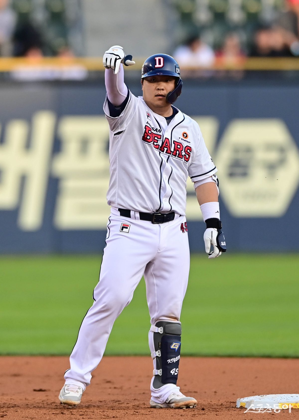 23일 서울 잠실야구장에서 열린 ‘2024 신한 SOL 뱅크 KBO리그’ 두산 베어스와 SSG 랜더스의 경기에서 2회말 무사 만루 두산 김기연이 선제 2타점 우전 2루타를 친 후 세리머니를 하고 있다.