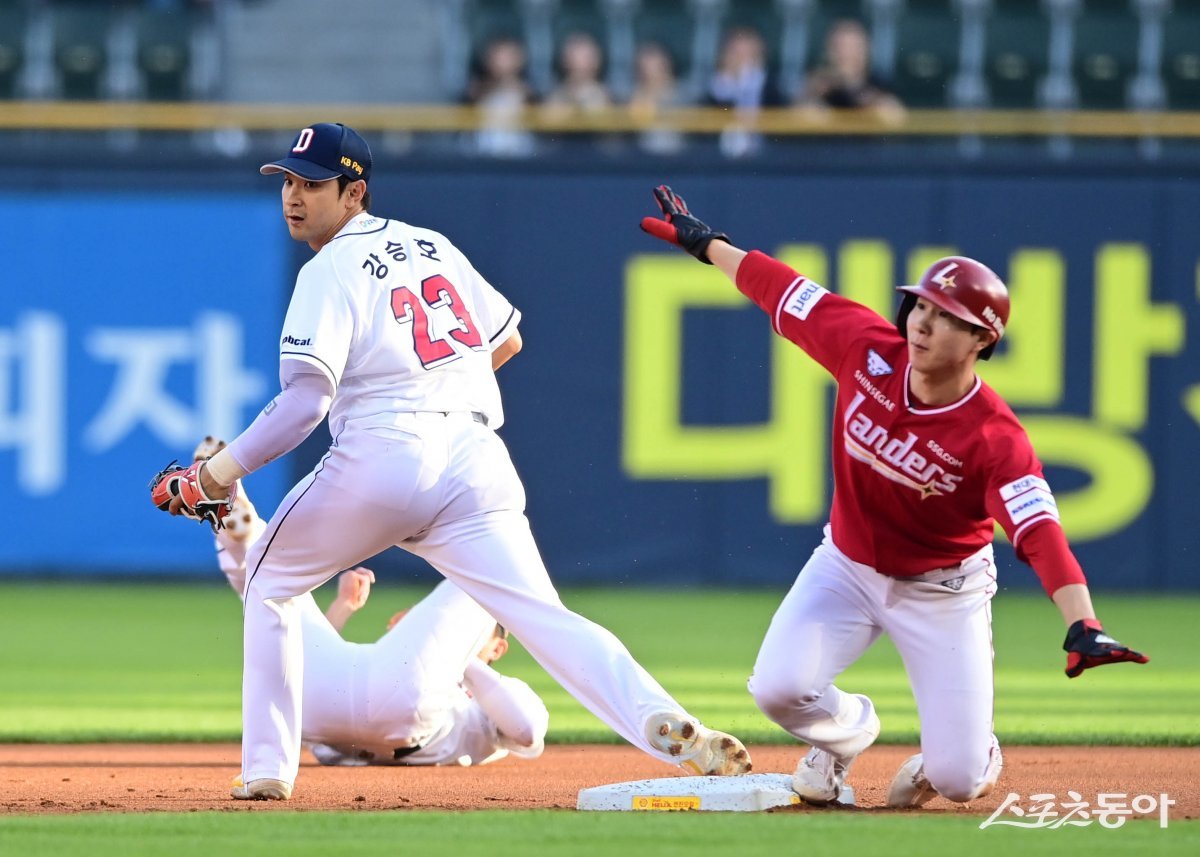 23일 서울 잠실야구장에서 열린 ‘2024 신한 SOL 뱅크 KBO리그’ 두산 베어스와 SSG 랜더스의 경기에서 1회초 1사 1, 2루 SSG의 내야 안타 때 두산 강승호가 1루주자 박성한에게 2루 진루를 허용하고 있다.