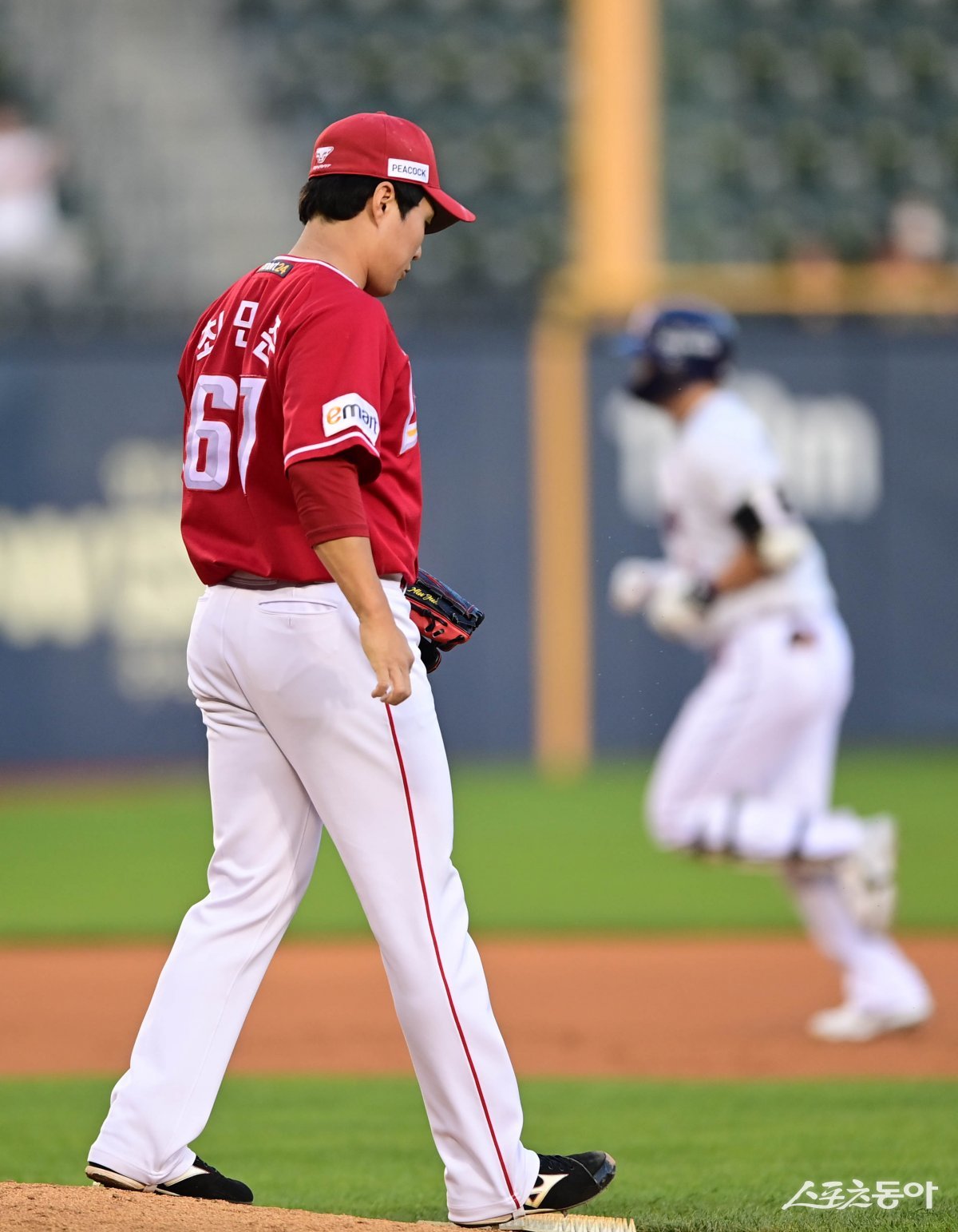 23일 서울 잠실야구장에서 열린 ‘2024 신한 SOL 뱅크 KBO리그’ 두산 베어스와 SSG 랜더스의 경기에서 2회말 2사 2, 3루 SSG에 3점 홈런을 허용한 SSG 최민준이 아쉬워하고 있다.