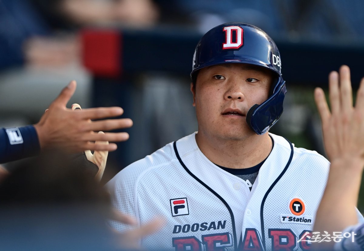 23일 서울 잠실야구장에서 열린 ‘2024 신한 SOL 뱅크 KBO리그’ 두산 베어스와 SSG 랜더스의 경기에서 2회말 무사 만루 두산의 중전 적시타 때 3루주자 김기연이 득점에 성공한 후 더그아웃에서 동료들과 기쁨을 나누고 있다. 잠실 | 주현희 기자 teth1147@donga.com