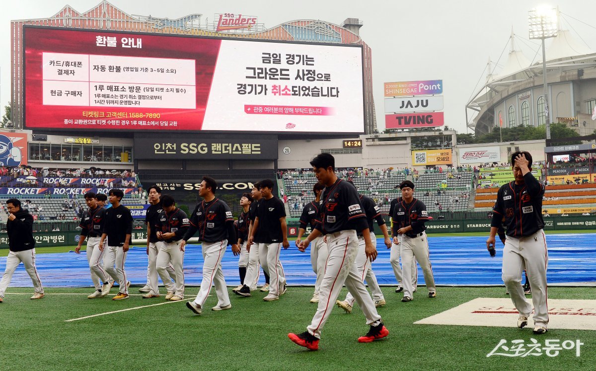 26일 인천 SSG 랜더스필드에서 ‘2024 신한 SOL 뱅크 KBO리그’ SSG 랜더스와 한화 이글스의 경기가 우천으로 취소됐다. 한화 선수들이 팬들에게 인사 후 더그아웃으로 향하고 있다.