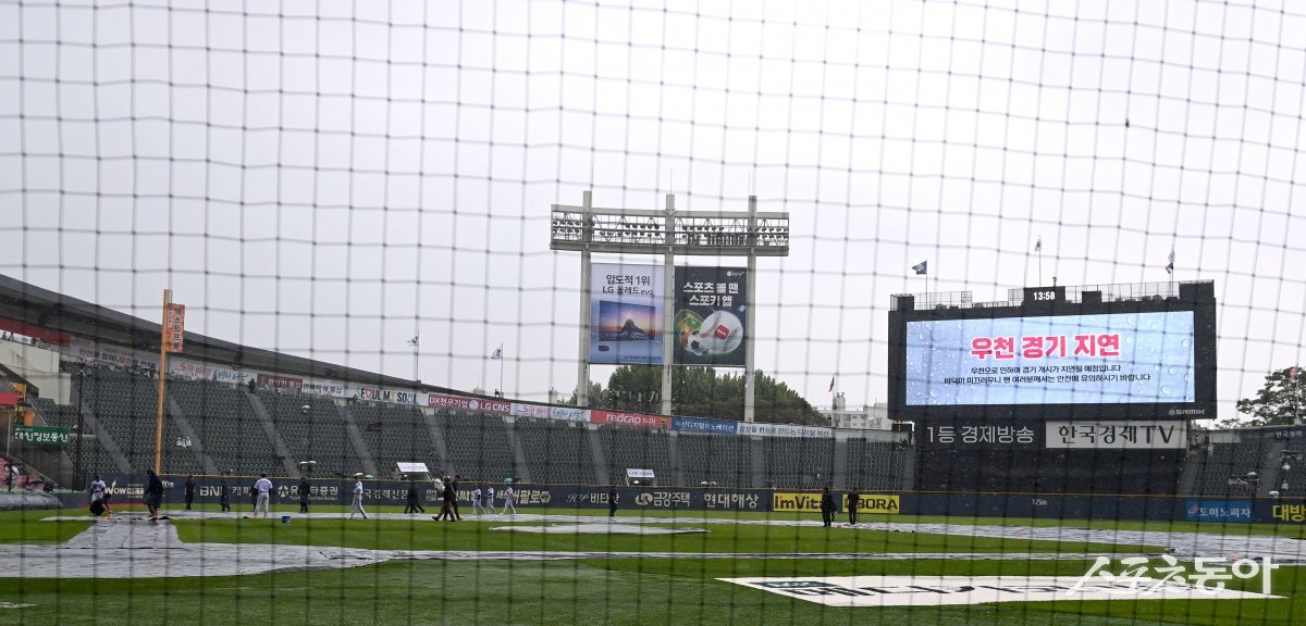 26일 서울 잠실야구장에서 열릴 ‘2024 신한은행 SOL뱅크 KBO리그’ NC 다이노스와 LG 트윈스 경기가 비가 내려 개시 지연이 되고 있다.