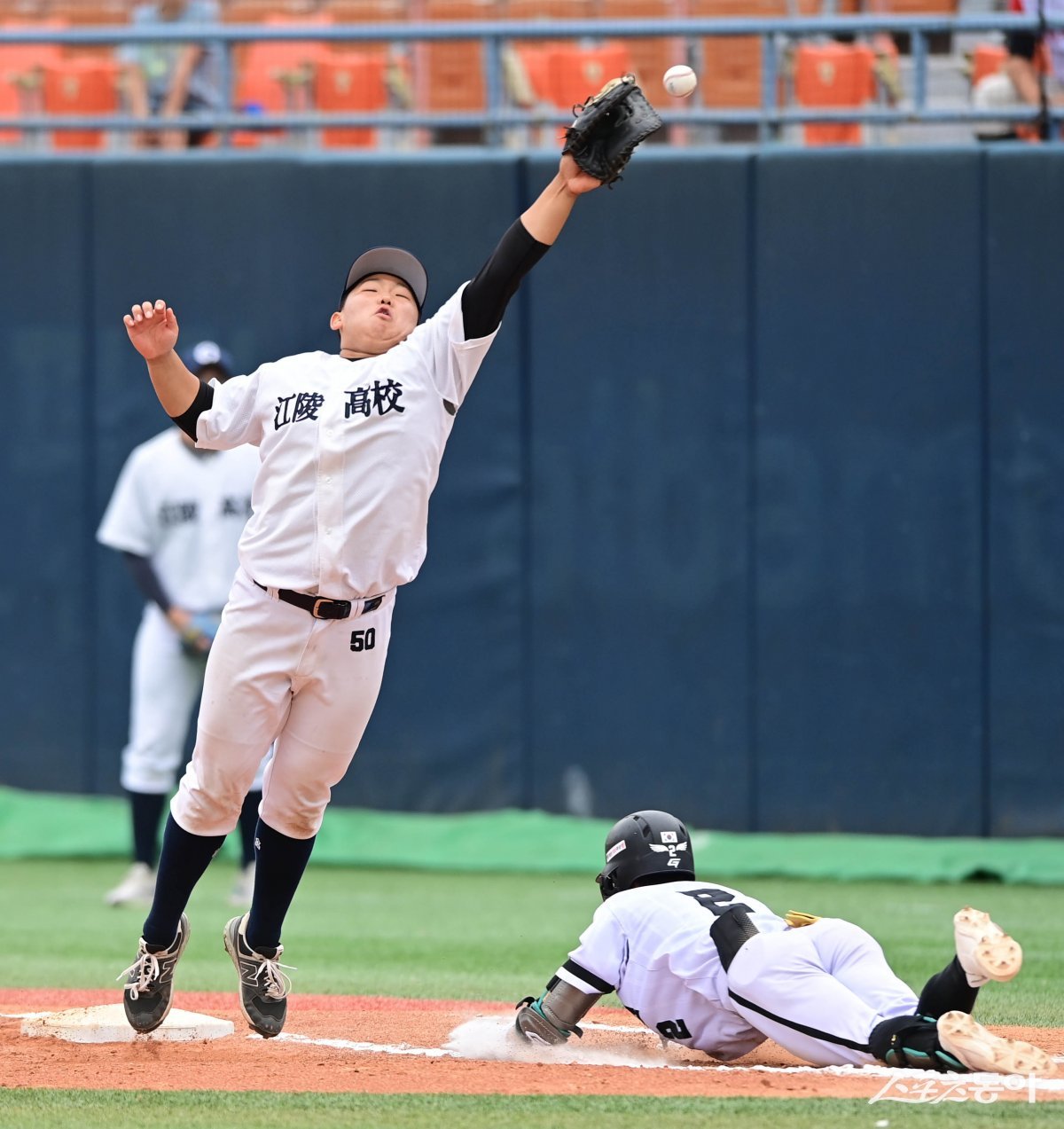 26일 서울 목동야구장에서 열린 ‘제78회 황금사자기 전국고교야구대회 겸 주말리그 왕중왕전’ 4강전 강릉고와 대구상원고의 경기에서 6회말 무사 대구상원고 박현준의 땅볼 때 강릉고의 송구 실책으로 1루수 송지훈이 볼을 놓치고 있다.