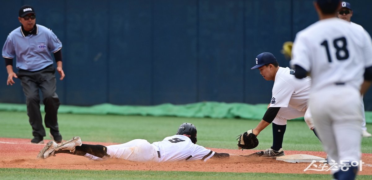 26일 서울 목동야구장에서 열린 ‘제78회 황금사자기 전국고교야구대회 겸 주말리그 왕중왕전’ 4강전 강릉고와 대구상원고의 경기에서 4회말 2사 1, 2루 대구상원고 함수호의 타석 때 1루주자 이민준이 강릉고의 경제에 1루주자 송지훈에게 태그 아웃되고 있다.