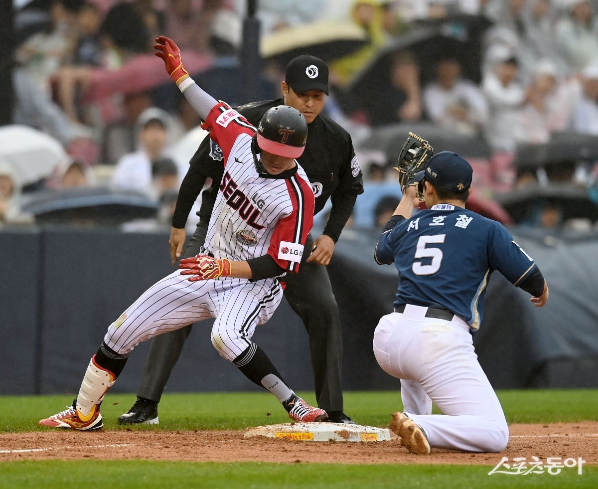 26일 서울 잠실야구장에서 ‘2024 신한은행 SOL뱅크 KBO리그’ NC 다이노스와 LG 트윈스 경기가 열렸다. 5회말 1사 만루 LG 박해민이 역전 3타점 중전 3루타를 치고 3루에서 세이프 되고 있다.