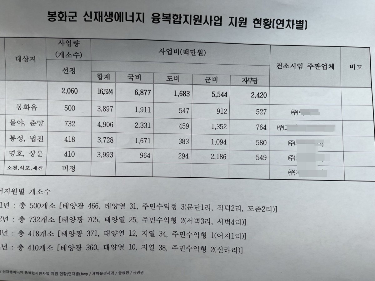 봉화군의 ‘신재생에너지 융복합지원사업’에 4년 연속으로 선정된 특정 업체를 두고 뒷말이 무성하다.26일 스포츠동아는 제보에 따른 취재를 종합한 결과, 이 업체는 봉화군이 지난 2021년부터 ‘신재생에너지 융복합지원사업’을 하면서 컨소시엄 주관업체 기준으로 2021년과 2022년을 제외한 2023~2024년까지 2년 동안 특정업체가 맡아 사업을 완료한 것으로 확인됐다.