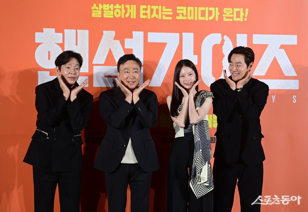 배우 박지환, 이성민, 공승연, 이희준이 27일 서울 광진구 자양동 롯데시네마 건대입구점에서 열린 영화 ‘핸섬가이즈’ 제작보고회에서 포즈를 취하고 있다.