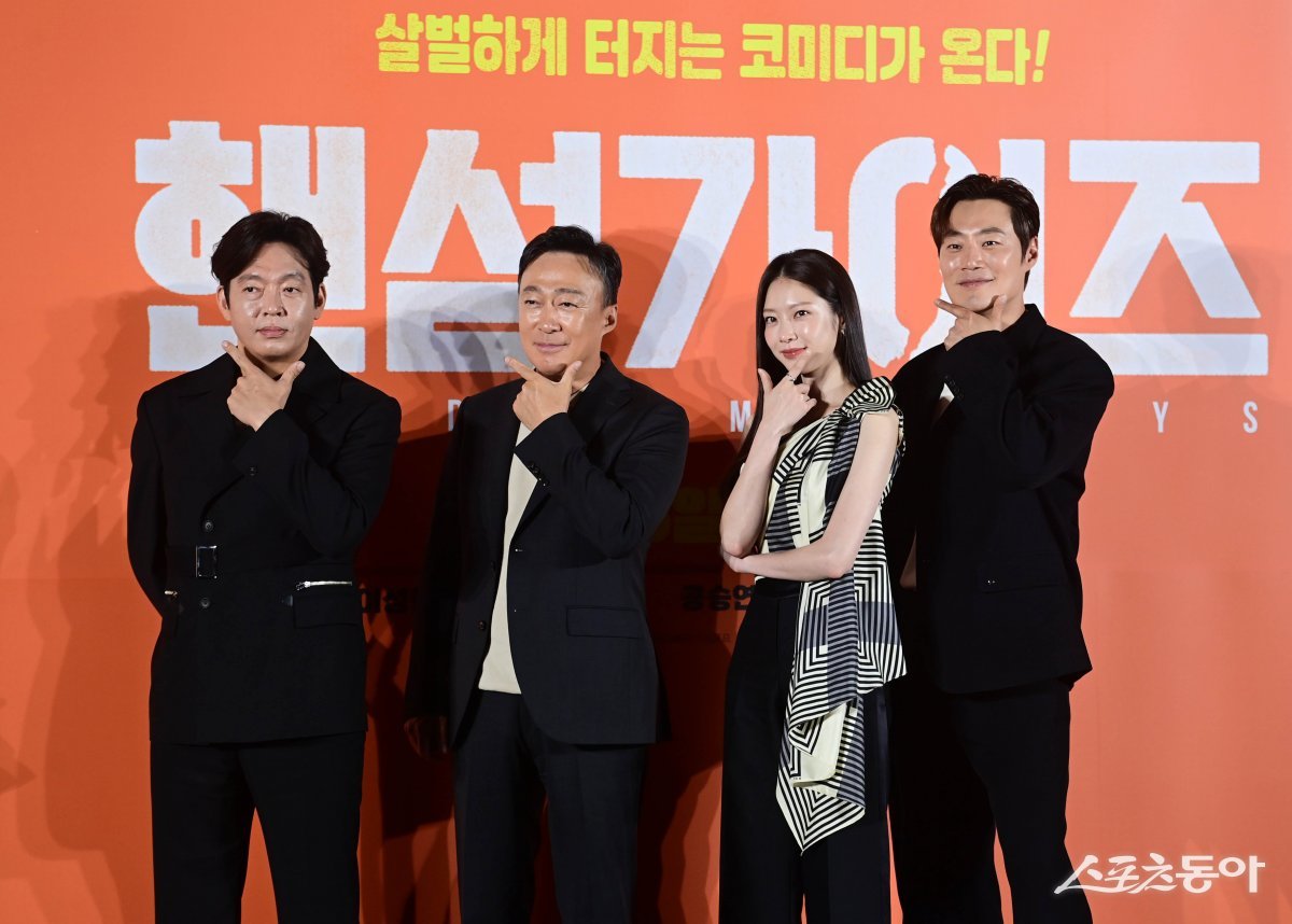 배우 박지환, 이성민, 공승연, 이희준이 27일 서울 광진구 자양동 롯데시네마 건대입구점에서 열린 영화 ‘핸섬가이즈’ 제작보고회에서 포즈를 취하고 있다.
