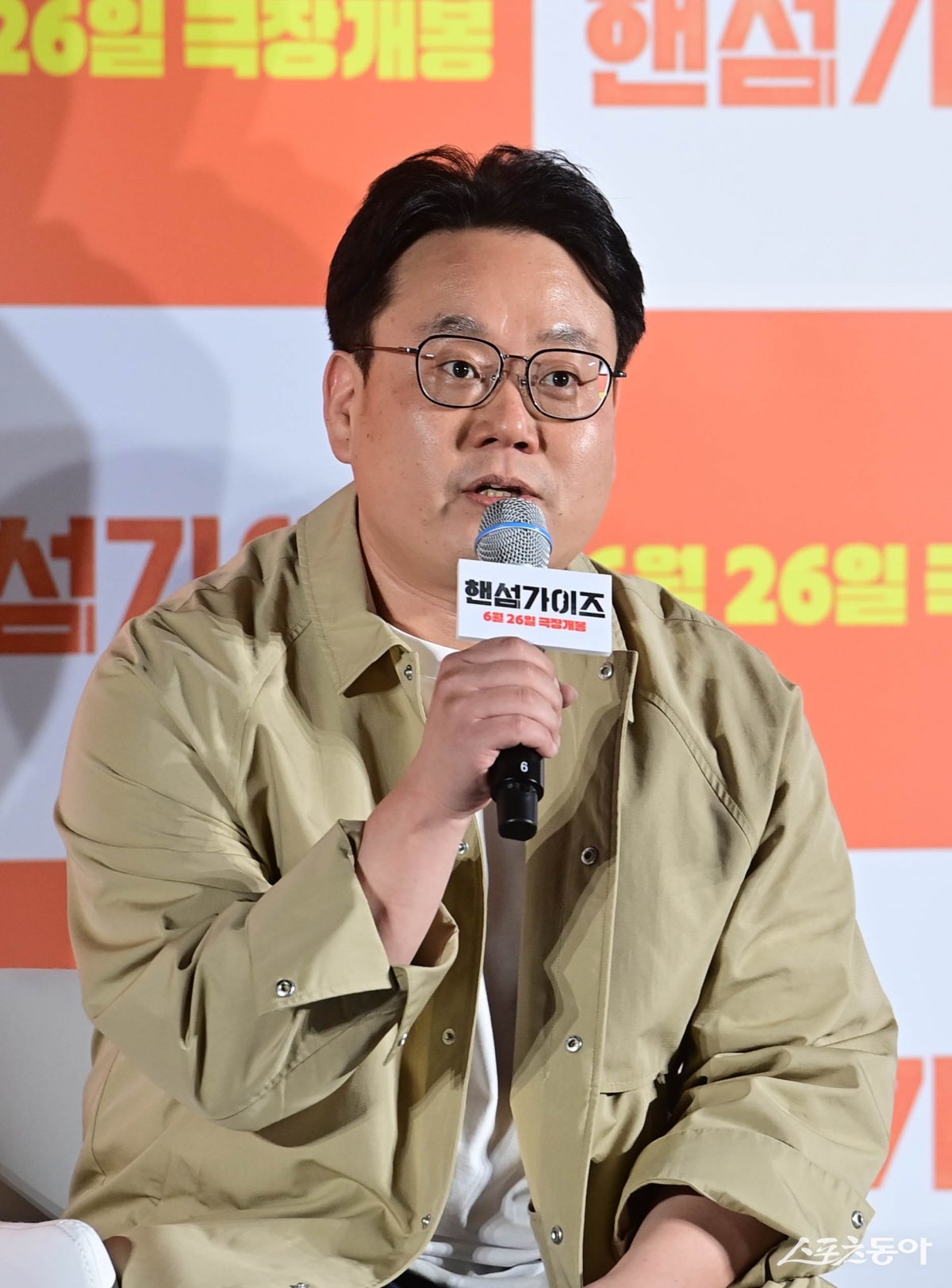 남동협 감독이 27일 서울 광진구 자양동 롯데시네마 건대입구점에서 열린 영화 ‘핸섬가이즈’ 제작보고회에서 인사말을 하고 있다.