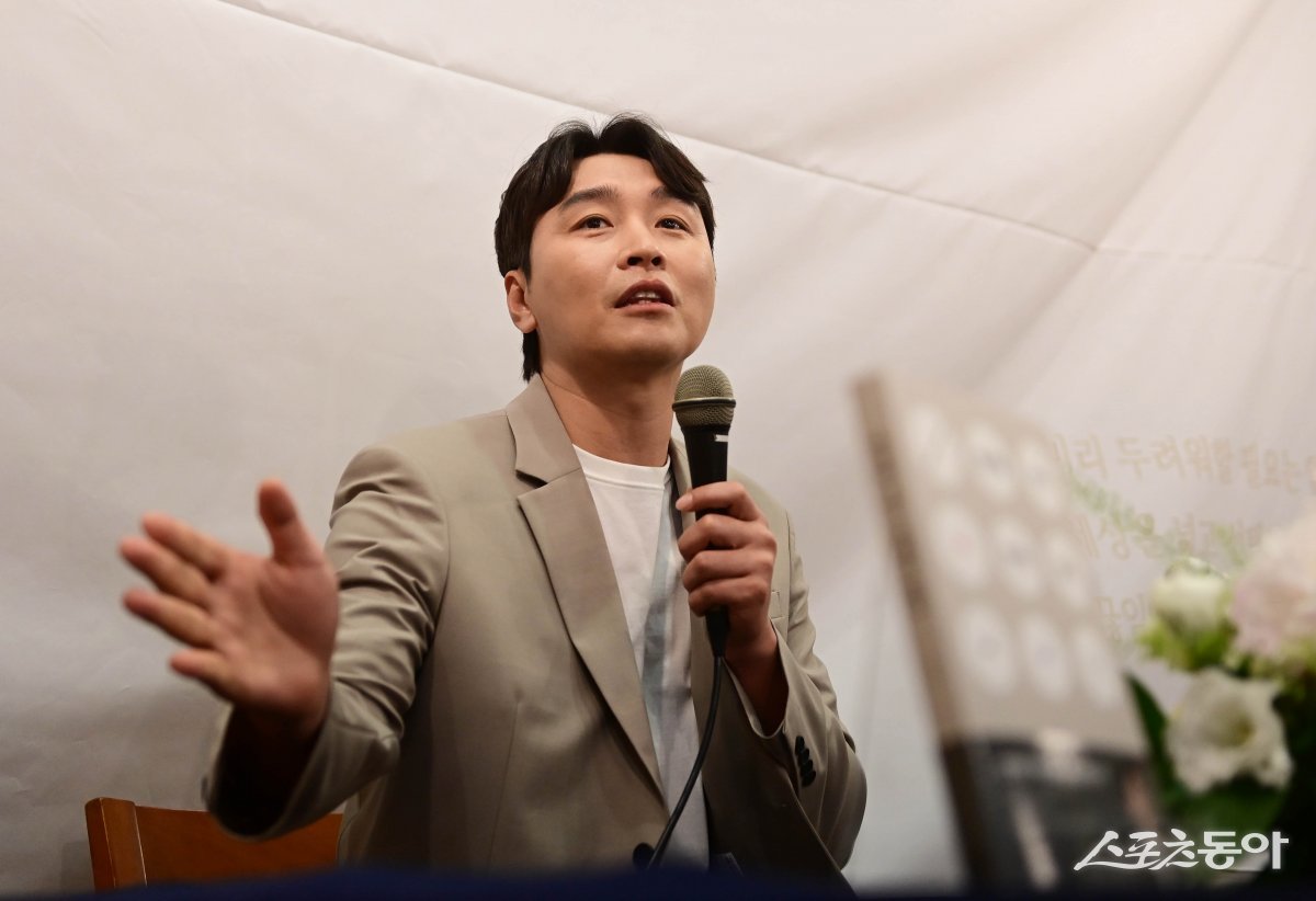 전 축구선수 이동국이 27일 서울 중구 정동 한 북카페에서 열린 신간 ‘결과를 아는 선택은 없다’ 출간 기자간담회에서 질문에 답하고 있다.