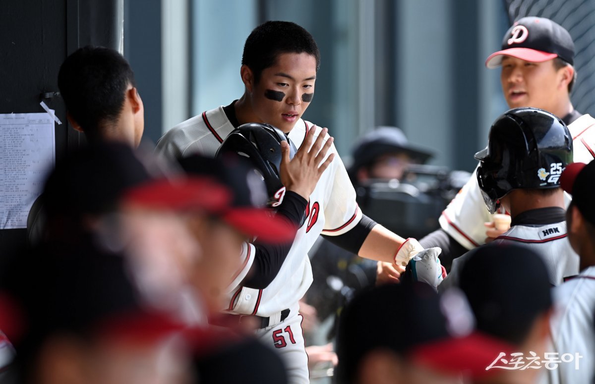 27일 서울 목동야구장에서 ‘제 78회 황금사자기 전국고교야구대회 겸 주말리그 왕중왕전(동아일보사·스포츠동아·대한야구소프트볼협회 공동주최)’ 덕수고와 서울컨벤션고의 4강 경기가 열렸다. 4회초 1사 2루에서 적시타 때 득점을 올린 덕수고 오시후가 동료들의 환영을 받고 있다.