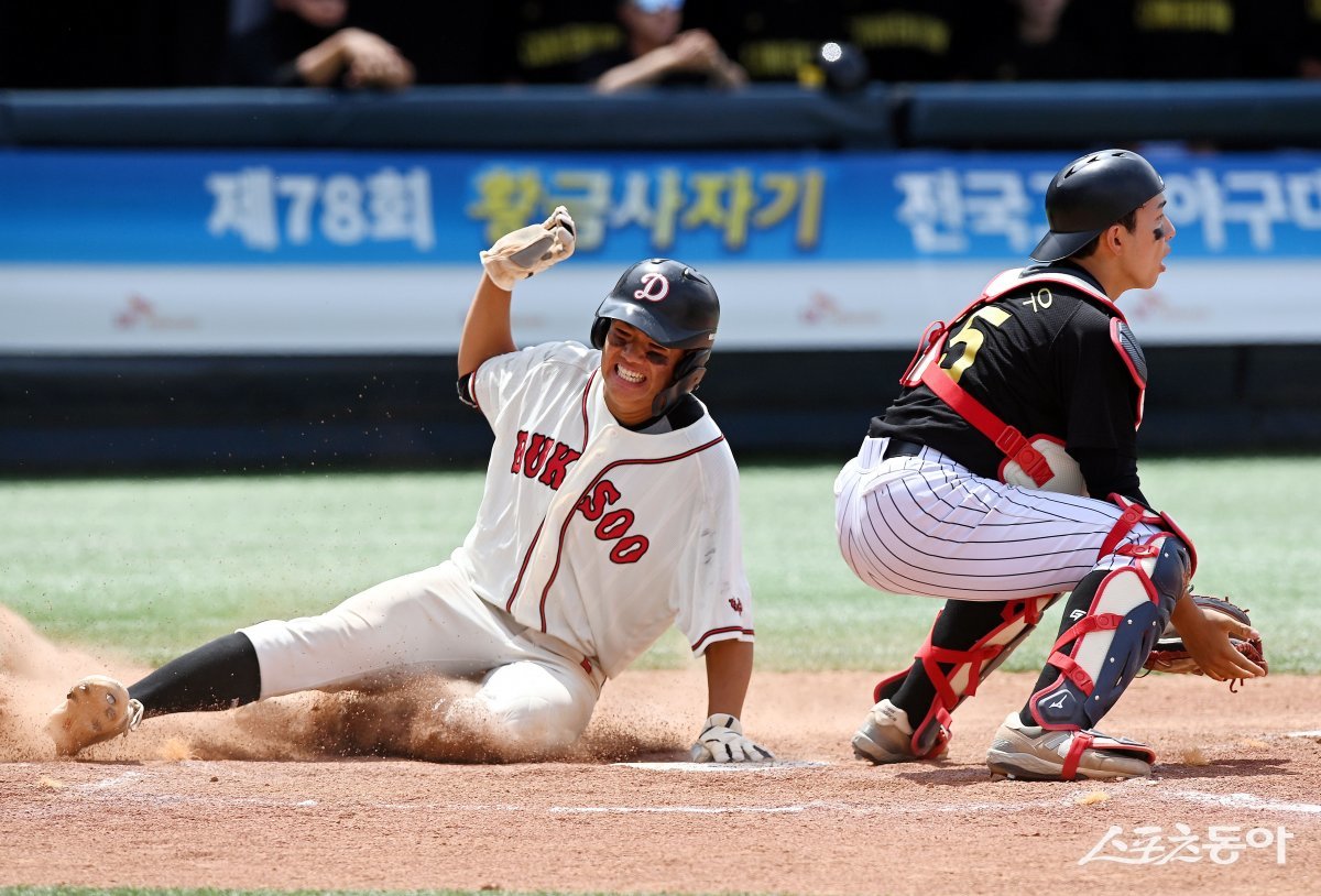 27일 서울 목동야구장에서 ‘제 78회 황금사자기 전국고교야구대회 겸 주말리그 왕중왕전(동아일보사·스포츠동아·대한야구소프트볼협회 공동주최)’ 덕수고와 서울컨벤션고의 4강 경기가 열렸다. 3회초 2사 1, 2루에서 적시타 때 엄준상이 득점을 올리고 있다.