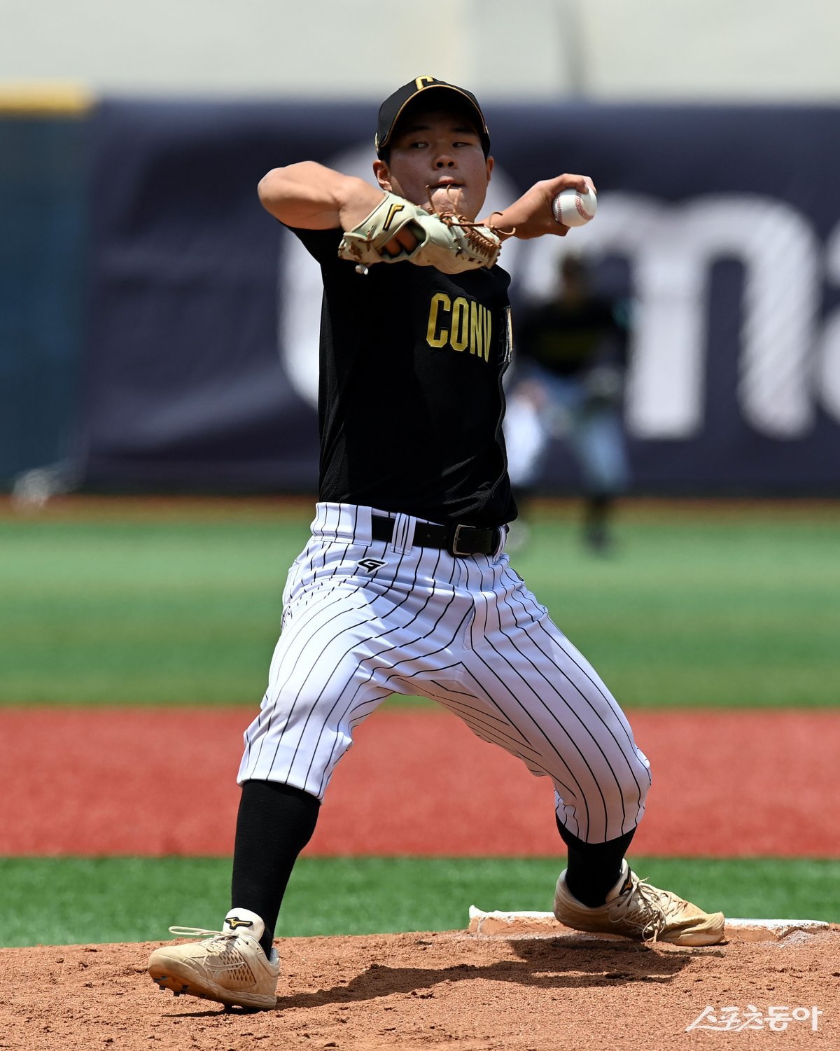 27일 서울 목동야구장에서 ‘제 78회 황금사자기 전국고교야구대회 겸 주말리그 왕중왕전(동아일보사·스포츠동아·대한야구소프트볼협회 공동주최)’ 덕수고와 서울컨벤션고의 4강 경기가 열렸다. 컨벤션고 선발투수 강동주가 힘차게 볼을 던지고 있다.