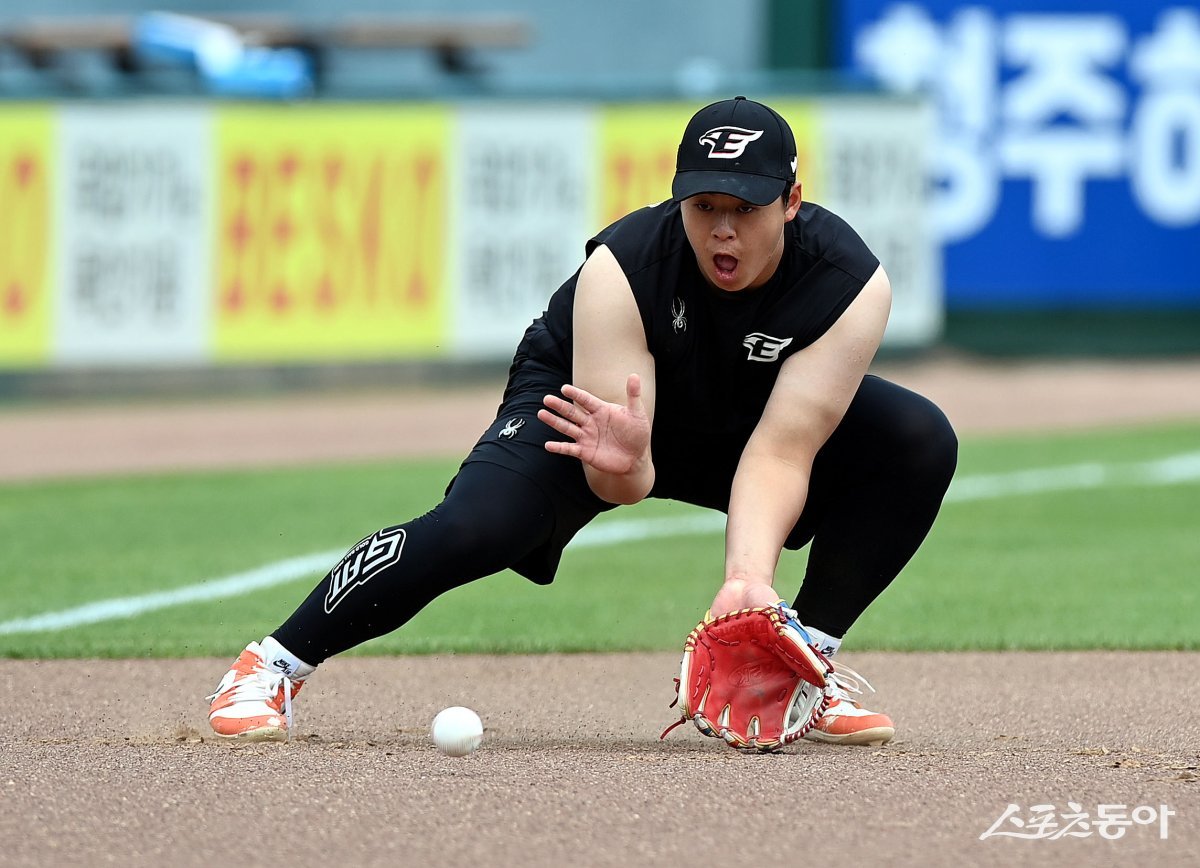 28일 대전 한화생명이글스파크에서 ‘2024 신한 SOL 뱅크 KBO리그’ 한화 이글스와 롯데 자이언츠의 경기가 열린다. 경기 전 한화 노시환이 3루 수비 훈련을 하고 있다.