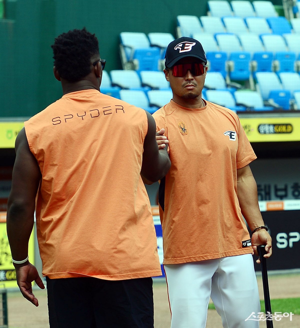 28일 대전 한화생명이글스파크에서 ‘2024 신한 SOL 뱅크 KBO리그’ 한화 이글스와 롯데 자이언츠의 경기가 열린다. 감독 자진 사퇴 후 한화 정경배 감독대행이 페라자와 인사를 나누고 있다.