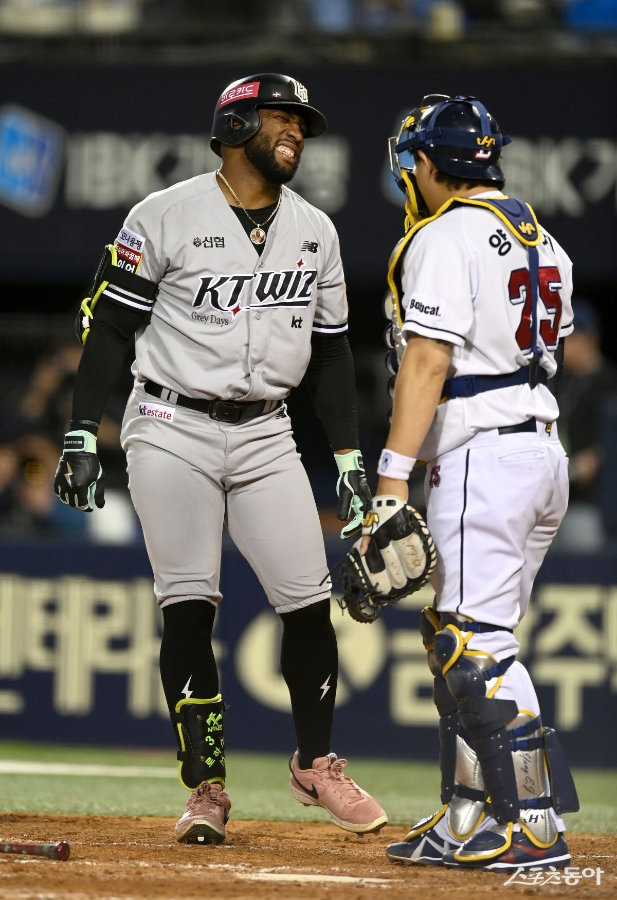 28일 서울 잠실야구장에서 ‘2024 신한은행 SOL뱅크 KBO리그’ KT 위즈와 두산 베어스 경기가 열렸다. 5회초 무사 KT 로하스가 볼에 맞고 고통스러워하고 있다.