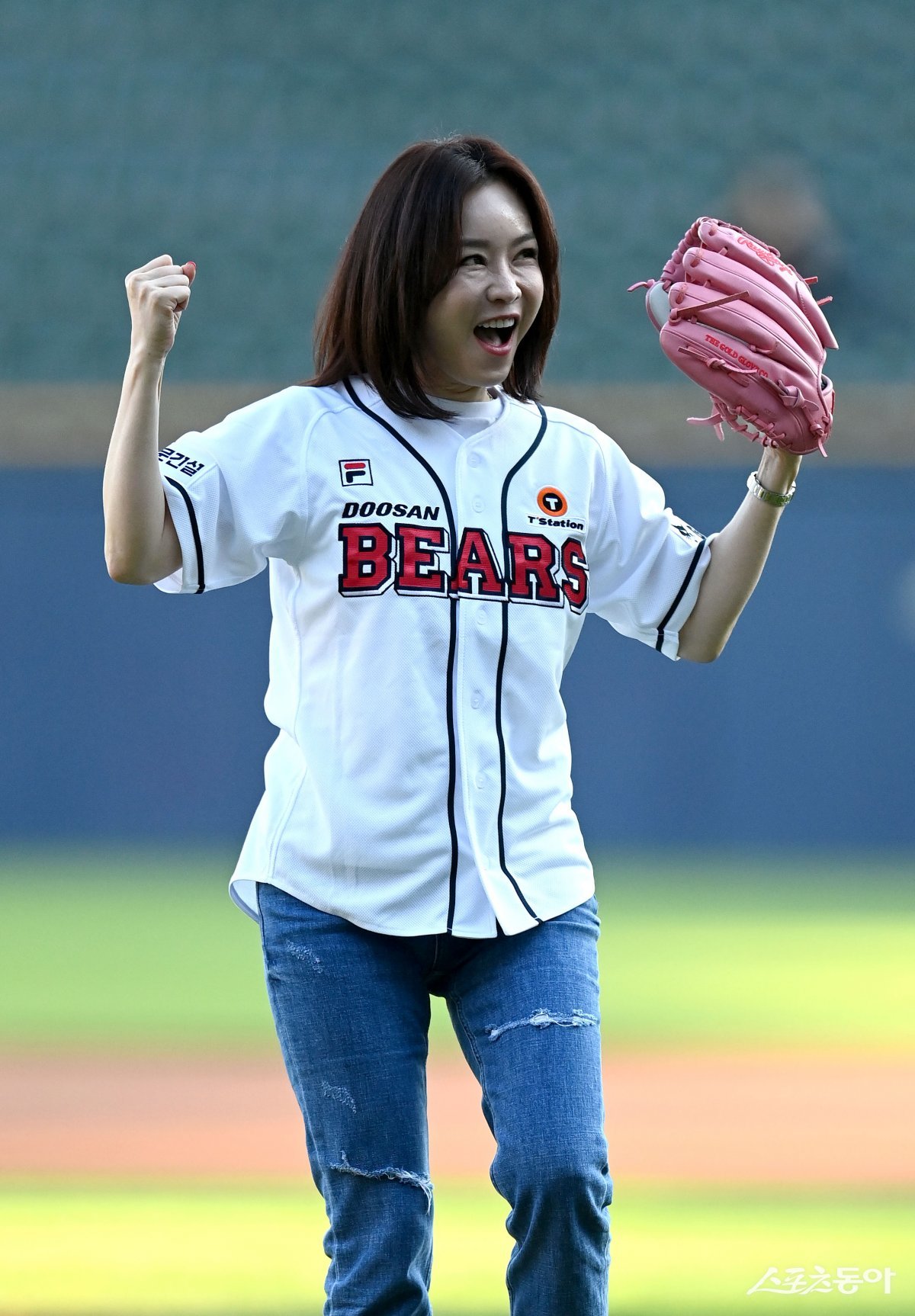 28일 서울 잠실야구장에서 ‘2024 신한은행 SOL뱅크 KBO리그’ KT 위즈와 두산 베어스 경기가 열렸다. 경기 전 배우 김정난이 시구를 하고 있다.