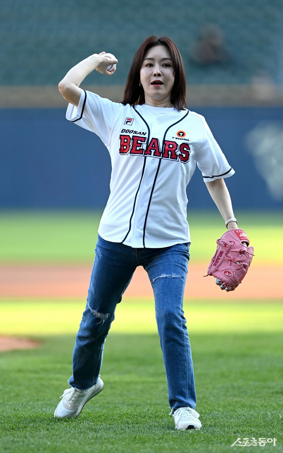 28일 서울 잠실야구장에서 ‘2024 신한은행 SOL뱅크 KBO리그’ KT 위즈와 두산 베어스 경기가 열렸다. 경기 전 배우 김정난이 시구를 하고 있다.