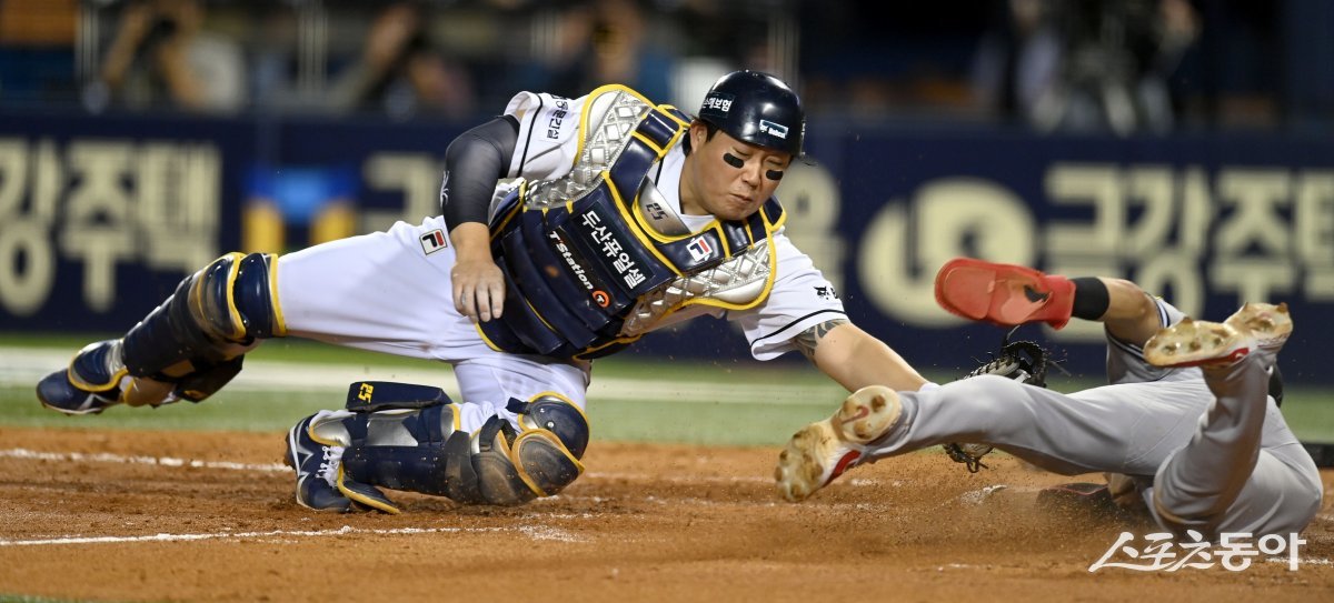 28일 서울 잠실야구장에서 ‘2024 신한은행 SOL뱅크 KBO리그’ KT 위즈와 두산 베어스 경기가 열렸다. 5회초 무사 만루 KT 문상철 우전 안타 때 2루주자 천성호가 홈까지 달려 세이프 되고 있다.