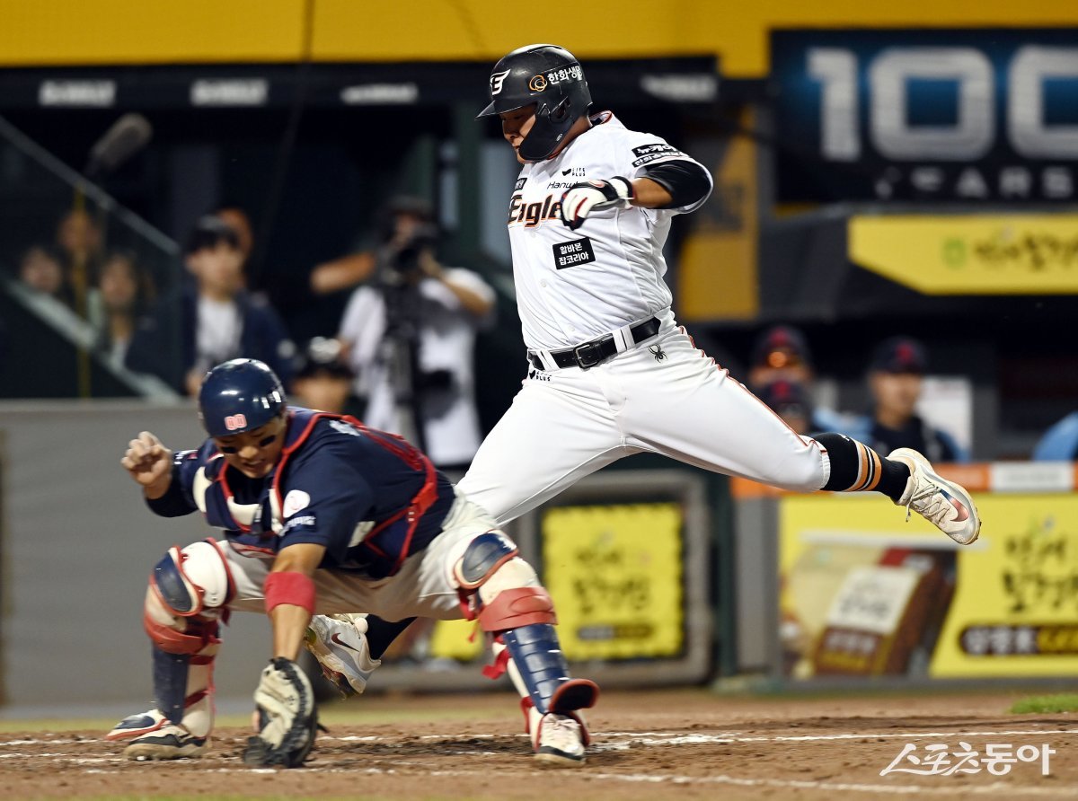 28일 대전 한화생명이글스파크에서 ‘2024 신한 SOL 뱅크 KBO리그’ 한화 이글스와 롯데 자이언츠의 경기가 열렸다. 5회말 무사 만루에서 내야땅볼 때 한화 3루 주자 김태연이 홈에서 포스 아웃되고 있다.