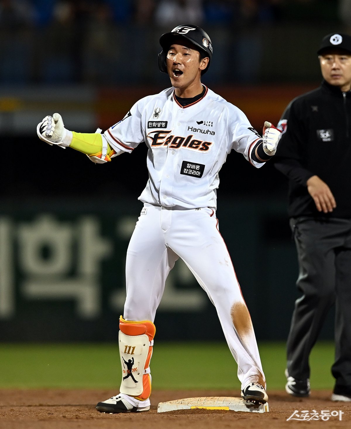 28일 대전 한화생명이글스파크에서 ‘2024 신한 SOL 뱅크 KBO리그’ 한화 이글스와 롯데 자이언츠의 경기가 열렸다. 5회말 1사 만루에서 한화 황영묵이 2타점 2루타를 날린 후 환호하고 있다.