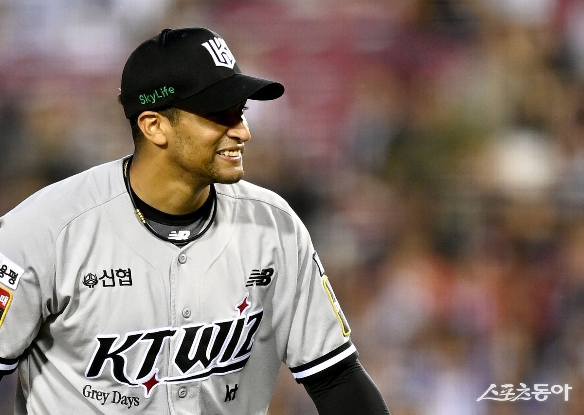 KT 쿠에바스가 4회말 2사 1,3루 상황에서 삼진으로 이닝을 마친 후 웃고 있다. 잠실 | 김종원 기자