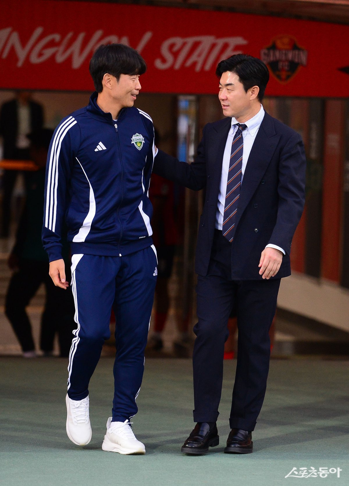 29일 춘천 송암스포츠타운에서 열린 프로축구 ‘하나은행 K리그1 2024’ 강원FC와 전북 현대 경기에서 전북 김두현 감독과 강원 윤정환 감독이 인사를 하고 있다.