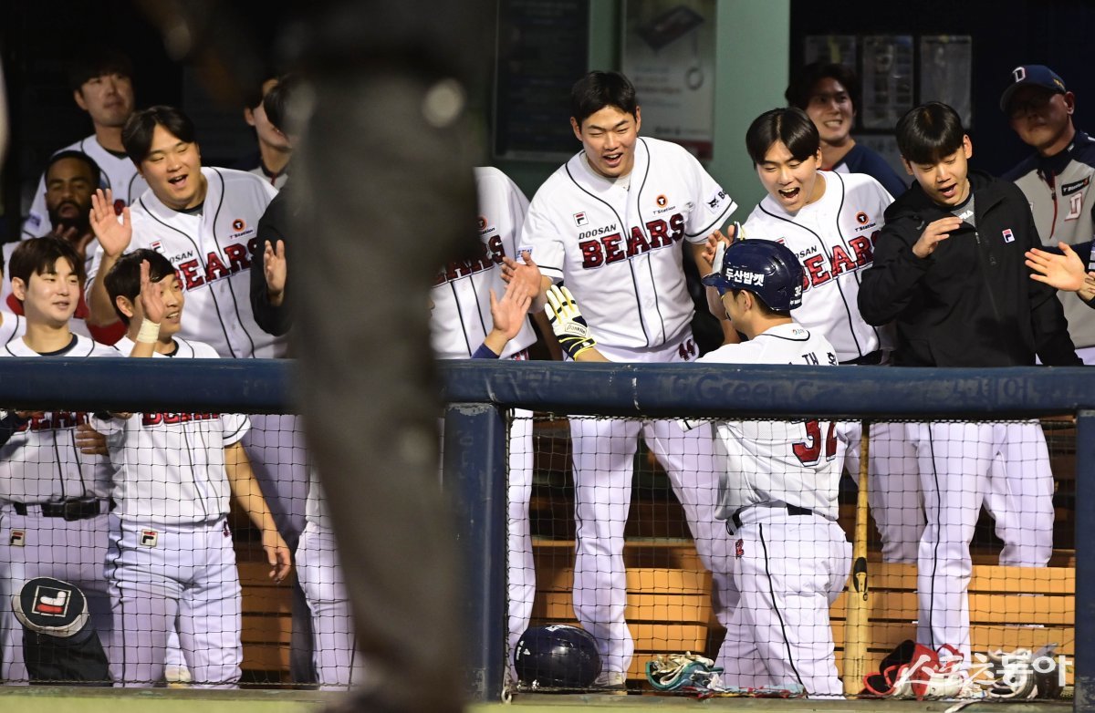 29일 서울 잠실야구장에서 열린 ‘2024 신한 SOL 뱅크 KBO리그’ KT 위즈와 두산 베어스의 경기에서 4회말 2사 1루 두산 김재환이 우월 2점홈런을 친 후 더그아웃에서 동료들의 축하를 받고 있다.