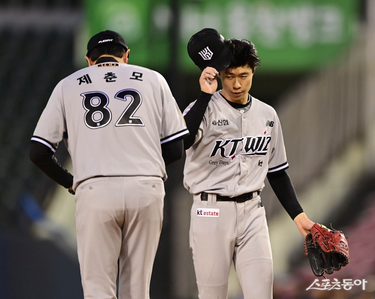 29일 서울 잠실야구장에서 열린 ‘2024 신한 SOL 뱅크 KBO리그’ KT 위즈와 두산 베어스의 경기에서 4회말 무사 만루 상황에서 KT 원상현이 마운드를 내려가고 있다.