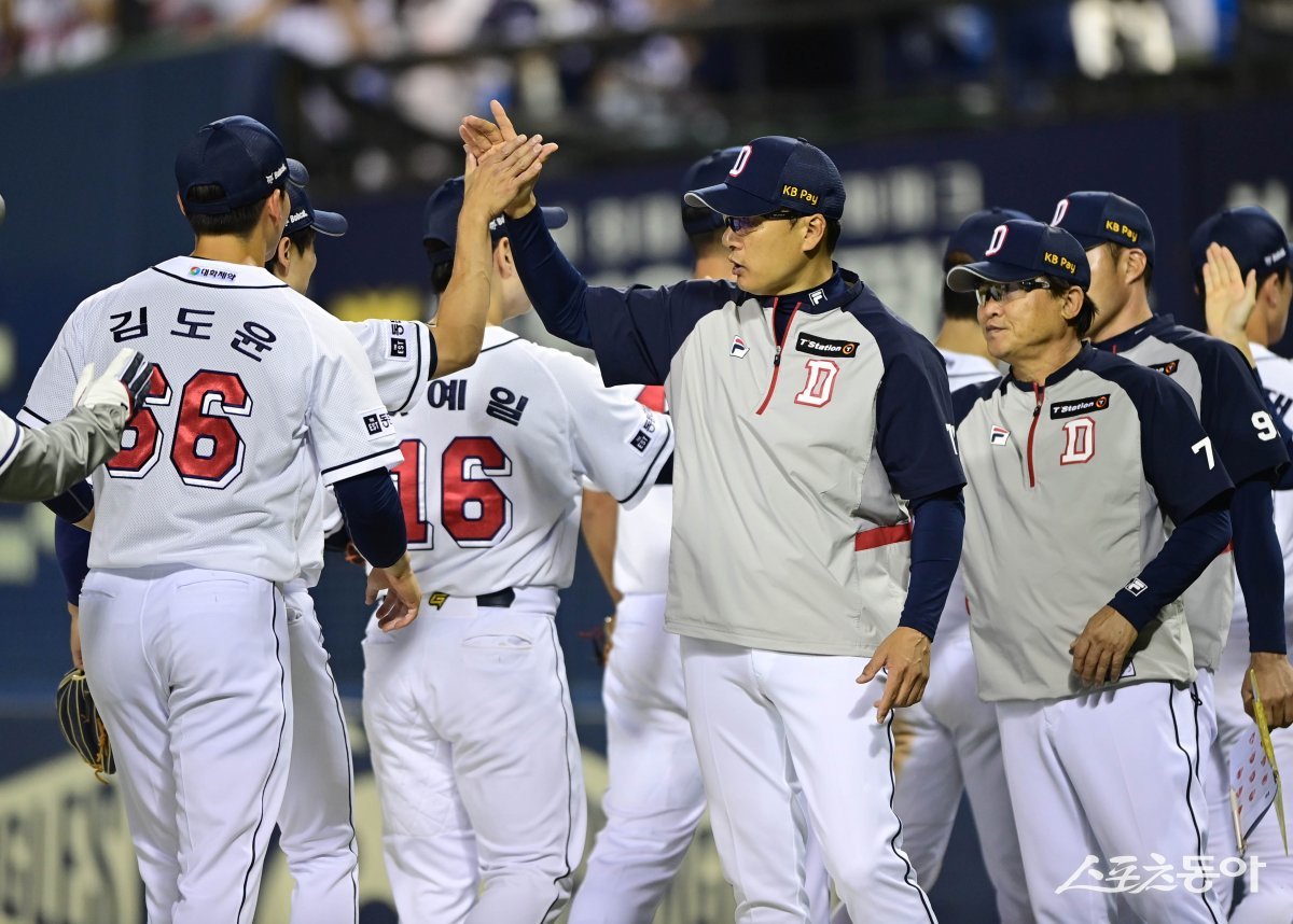 29일 서울 잠실야구장에서 열린 ‘2024 신한 SOL 뱅크 KBO리그’ KT 위즈와 두산 베어스의 경기에서 12-6으로 승리한 두산 이승엽 감독이 선수들과 기쁨을 나누고 있다.