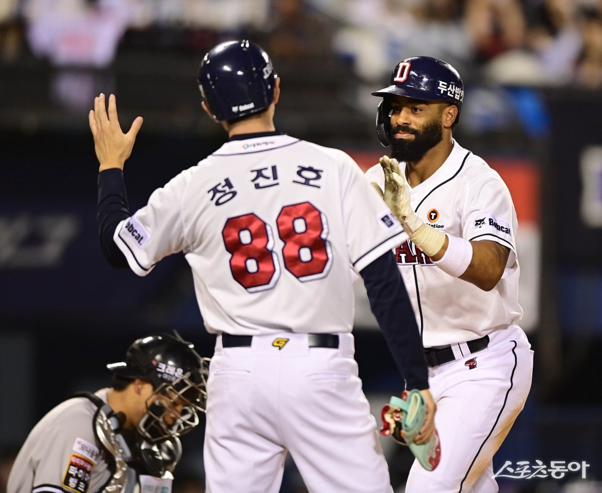 30일 서울 잠실야구장에서 열린 ‘2024 신한 SOL 뱅크 KBO리그’ KT 위즈와 두산 베어스의 경기에서 5회말 2사 2루 두산 라모스가 우월 2점 홈런을 친 후 1루코치와 기쁨을 나누고 있다.