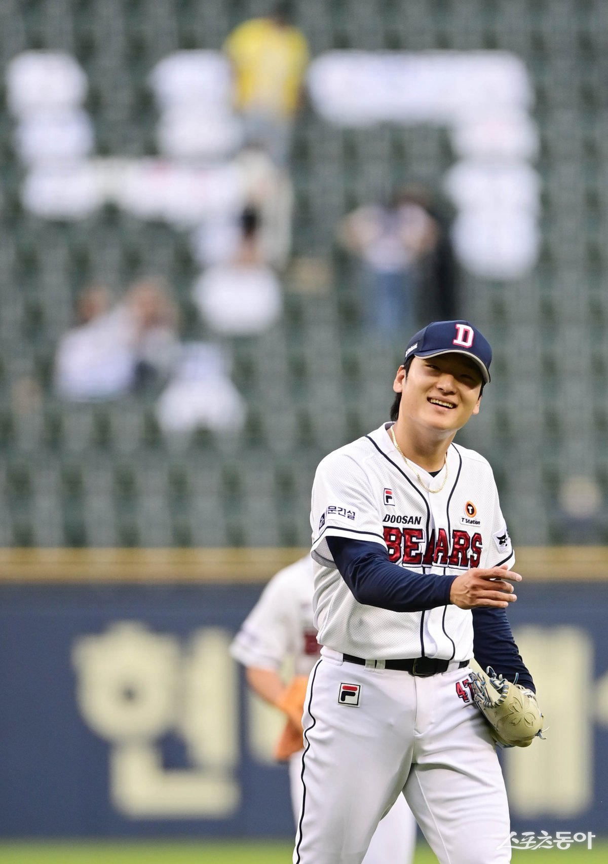 30일 서울 잠실야구장에서 열린 ‘2024 신한 SOL 뱅크 KBO리그’ KT 위즈와 두산 베어스의 경기에서 1회초 무실점으로 수비를 마친 두산 곽빈이 웃고 있다.