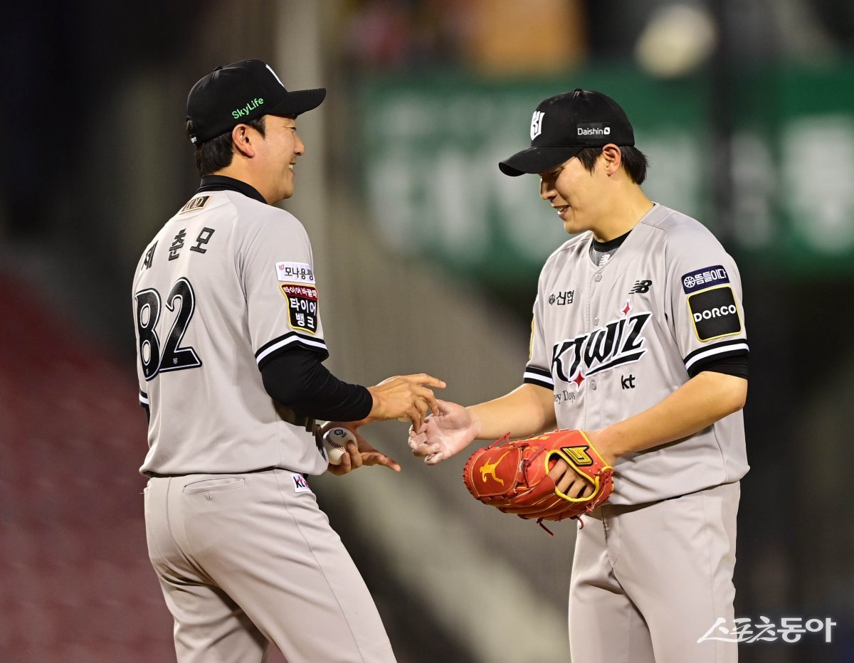 30일 서울 잠실야구장에서 열린 ‘2024 신한 SOL 뱅크 KBO리그’ KT 위즈와 두산 베어스의 경기에서 5회말 2사 1루 상황에서 KT 한차현이 웃으며 마운드를 내려오고 있다.