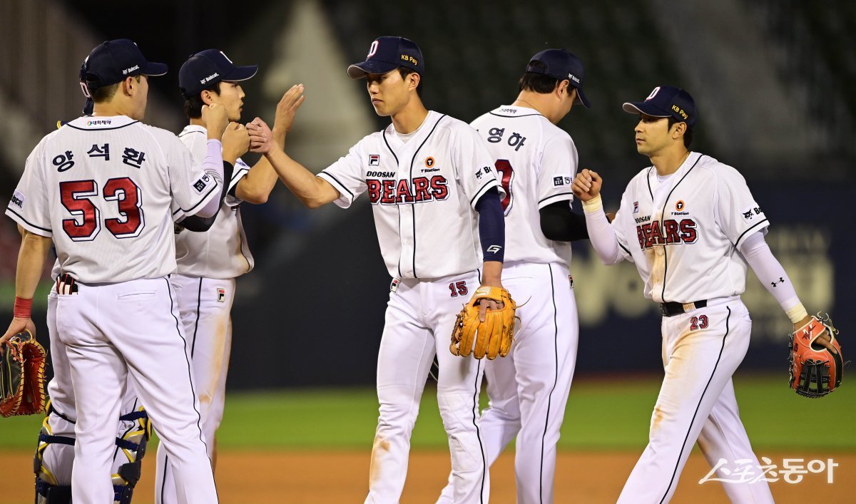 30일 서울 잠실야구장에서 열린 ‘2024 신한 SOL 뱅크 KBO리그’ KT 위즈와 두산 베어스의 경기에서 6-1로 승리한 두산 선수들이 기쁨을 나누고 있다.