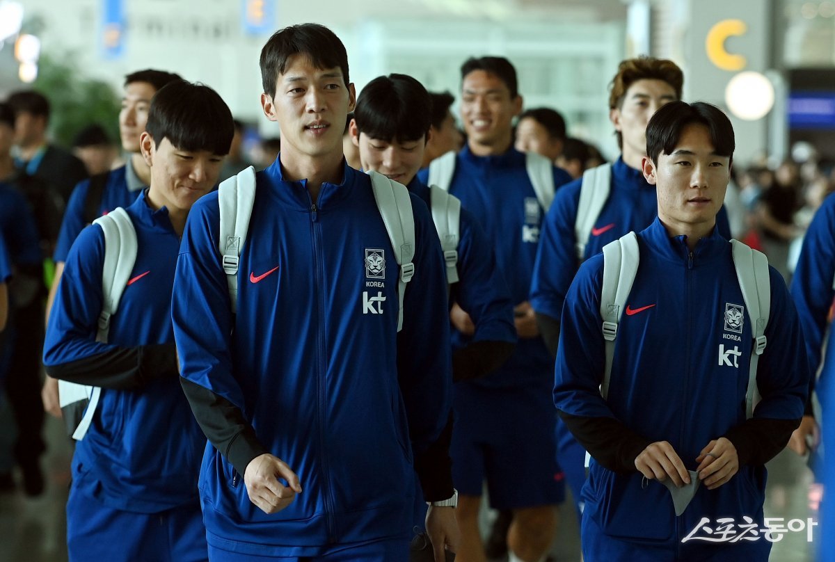 축구국가대표팀이 ‘2026 북중미월드컵 아시아 예선’ 싱가포르와의 경기를 위해 2일 인천국제공항을 통해 출국했다 축구대표팀 황인재와 엄원상이 출국장으로 향하고 있다.