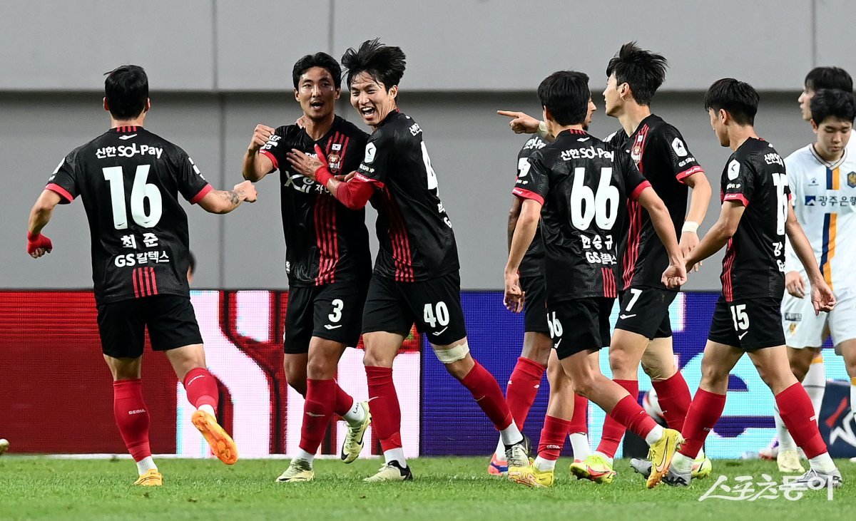 2일 서울 상암동 서울월드컵경기장에서 열린 ‘하나은행 K리그1 2024’ FC서울과 광주FC의 경기에서 서울 권완규가 1-1 동점골을 넣은 후 동료와 기쁨을 나누고 있다.