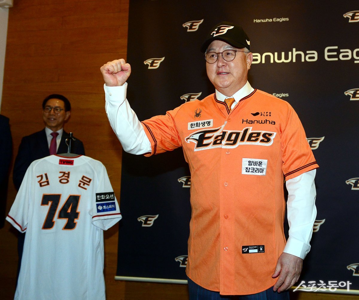 한화 이글스 제 14대 감독에 선임된 김경문 감독이 3일 대전 한화생명이글스파크에서 열린 취임식 및 기자회견에서 유니폼과 모자를 착용하고 있다. 대전 | 김종원 기자 won@donga.com