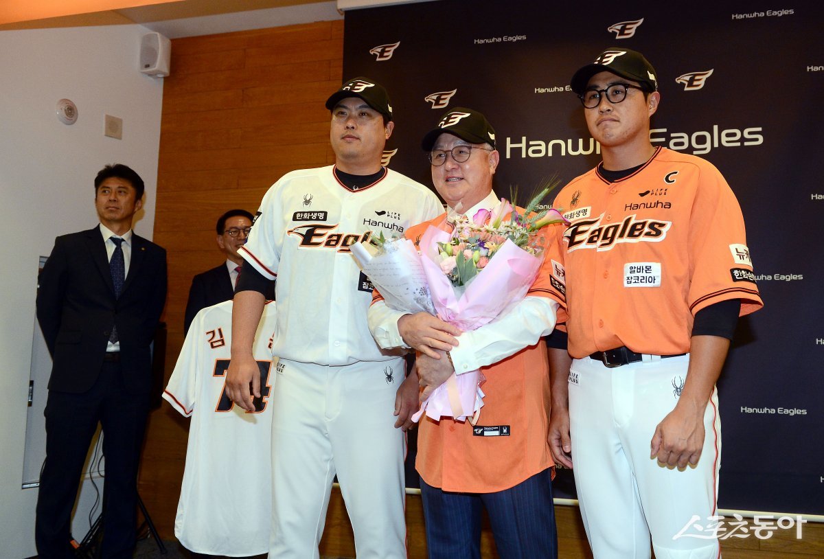 한화 이글스 제 14대 감독에 선임된 김경문 감독이 3일 대전 한화생명이글스파크에서 열린 취임식 및 기자회견에서 류현진, 채은성과 기념촬영을 하고 있다. 대전 | 김종원 기자 won@donga.com