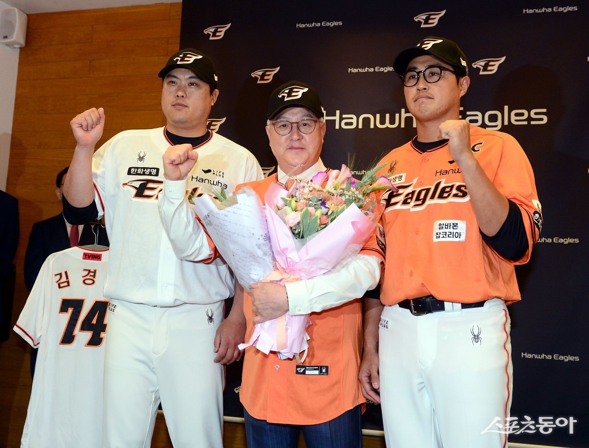 한화 이글스 제 14대 감독에 선임된 김경문 감독이 3일 대전 한화생명이글스파크에서 열린 취임식 및 기자회견에서 류현진, 채은성과 기념촬영을 하고 있다. 대전 | 김종원 기자 won@donga.com