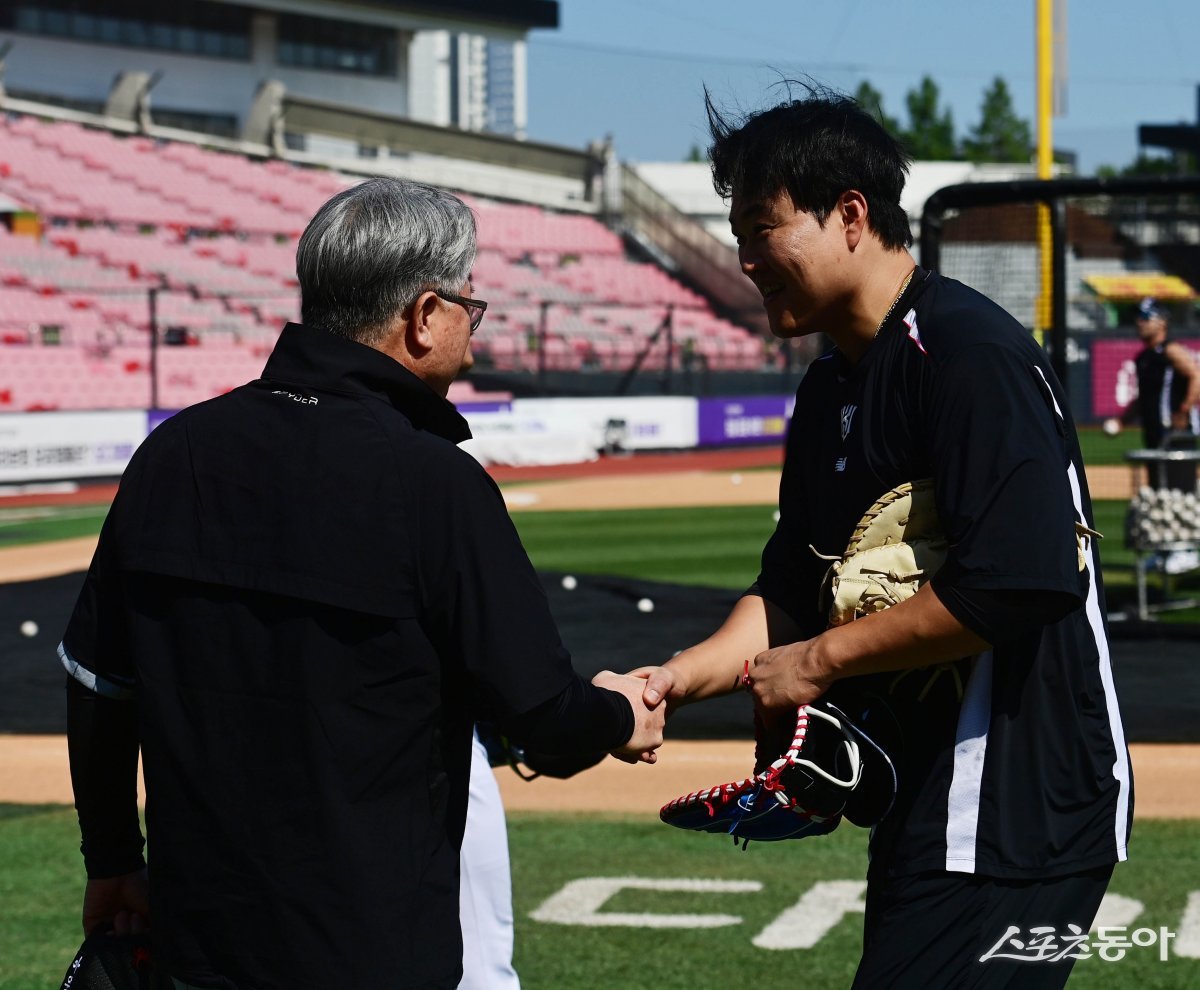 4일 경기도 수원KT위즈파크에서 열린 ‘2024 신한 SOL 뱅크 KBO리그’ 한화 이글스와 KT 위즈의 경기에 앞서 KT 오재일이 한화 김경문 감독과 인사하고 있다.