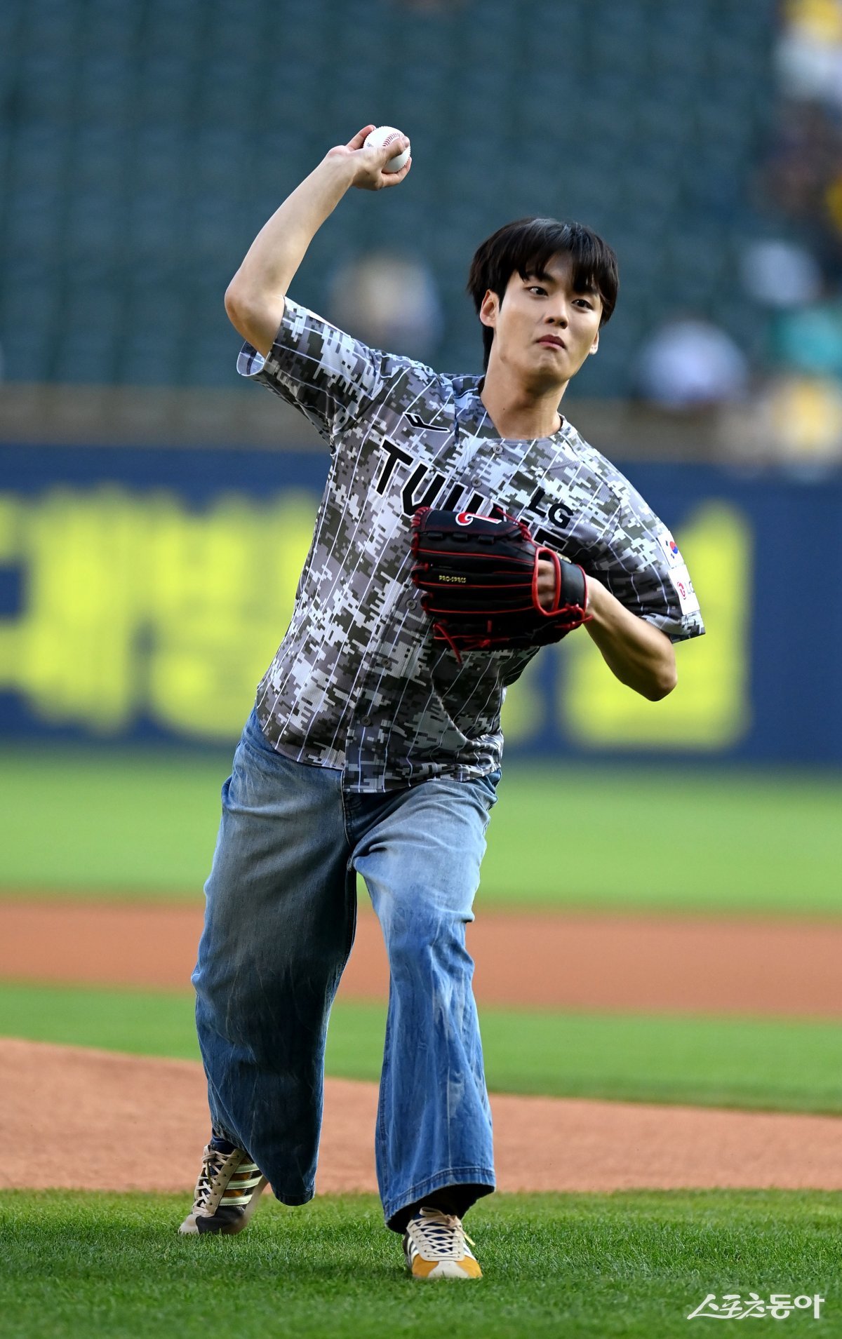 4일 서울 잠실야구장에서 ‘2024 신한은행 SOL뱅크 KBO리그’ 키움 히어로즈와 LG 트윈스 경기가 열렸다. 가수 잠골버스 정일호가 시구를 하고 있다.