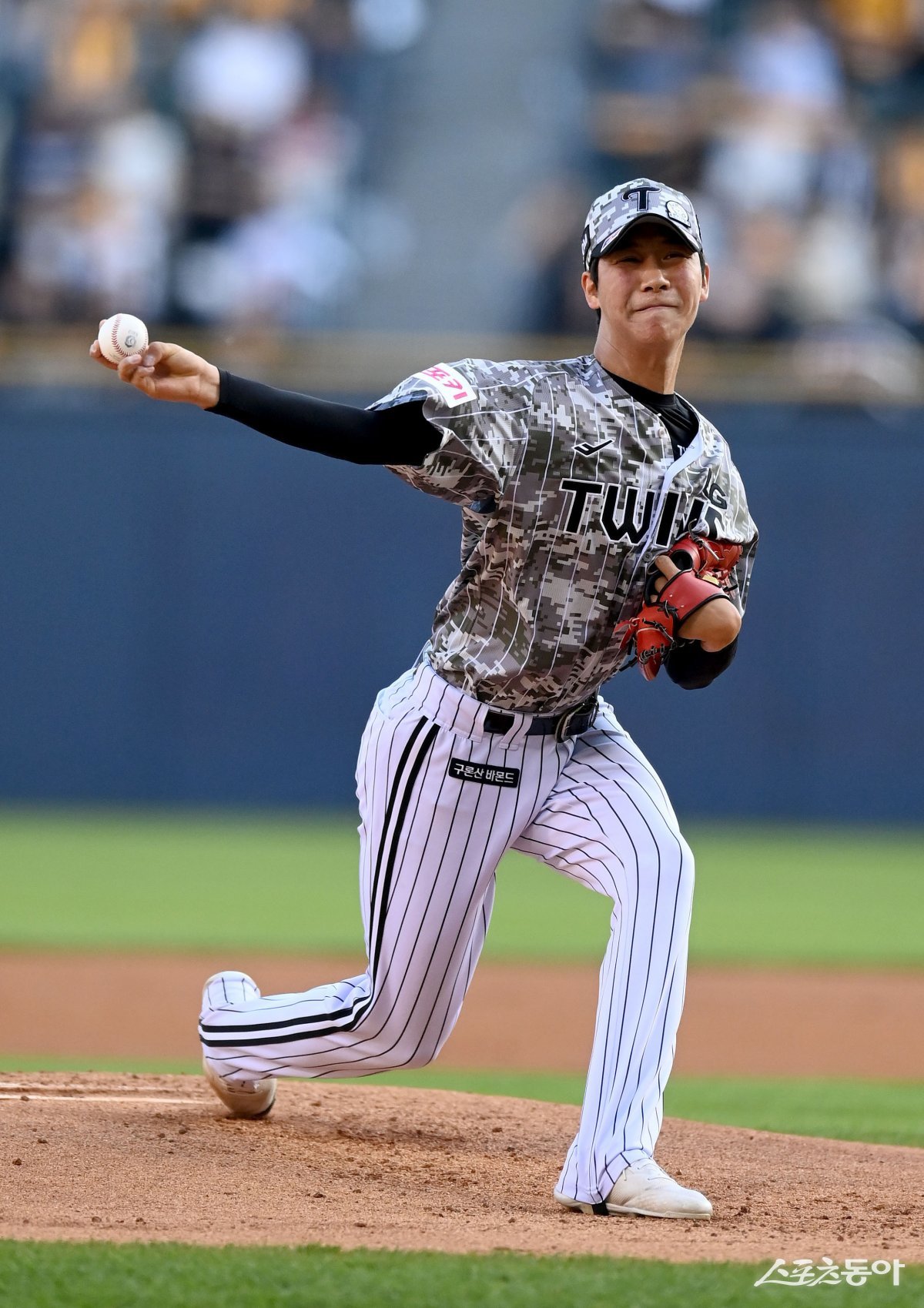 4일 서울 잠실야구장에서 ‘2024 신한은행 SOL뱅크 KBO리그’ 키움 히어로즈와 LG 트윈스 경기가 열렸다. 선발 투수로 등판한 LG 이믿음이 역투하고 있다.