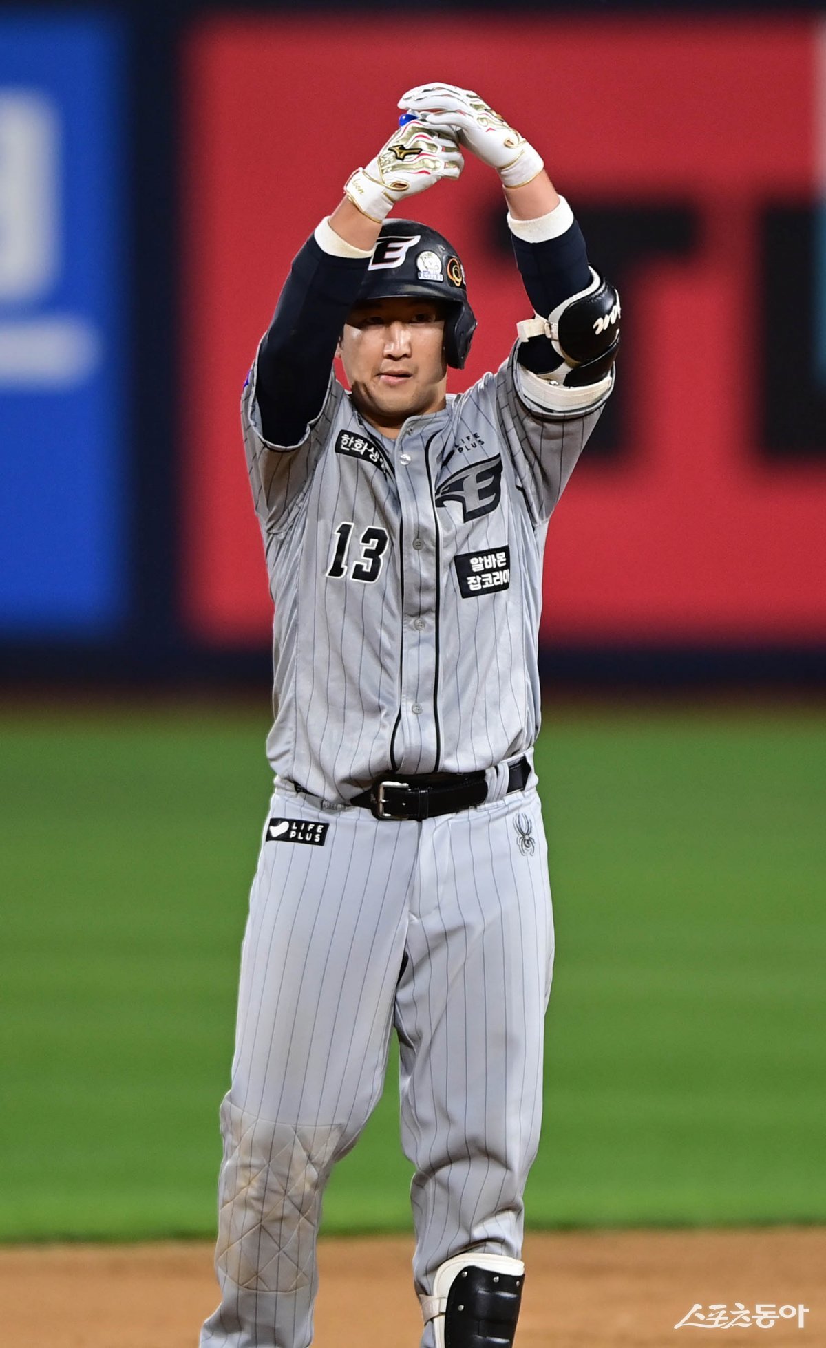 4일 경기도 수원KT위즈파크에서 열린 ‘2024 신한 SOL 뱅크 KBO리그’ 한화 이글스와 KT 위즈의 경기에서 8회초 1사 1, 2루 한화 최재훈이 1타점 좌전 2루타를 친 후 세리머니를 하고 있다.