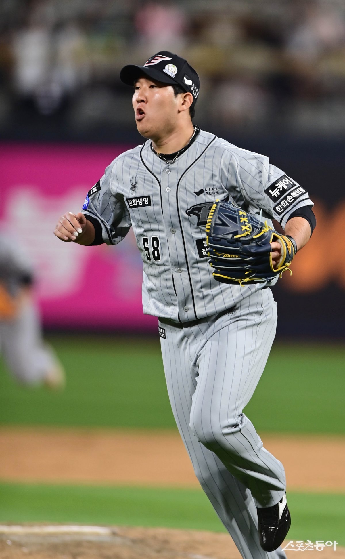 4일 경기도 수원KT위즈파크에서 열린 ‘2024 신한 SOL 뱅크 KBO리그’ 한화 이글스와 KT 위즈의 경기에서 7회말 무실점으로 수비를 마친 후 한화 박상원이 기뻐하고 있다.
