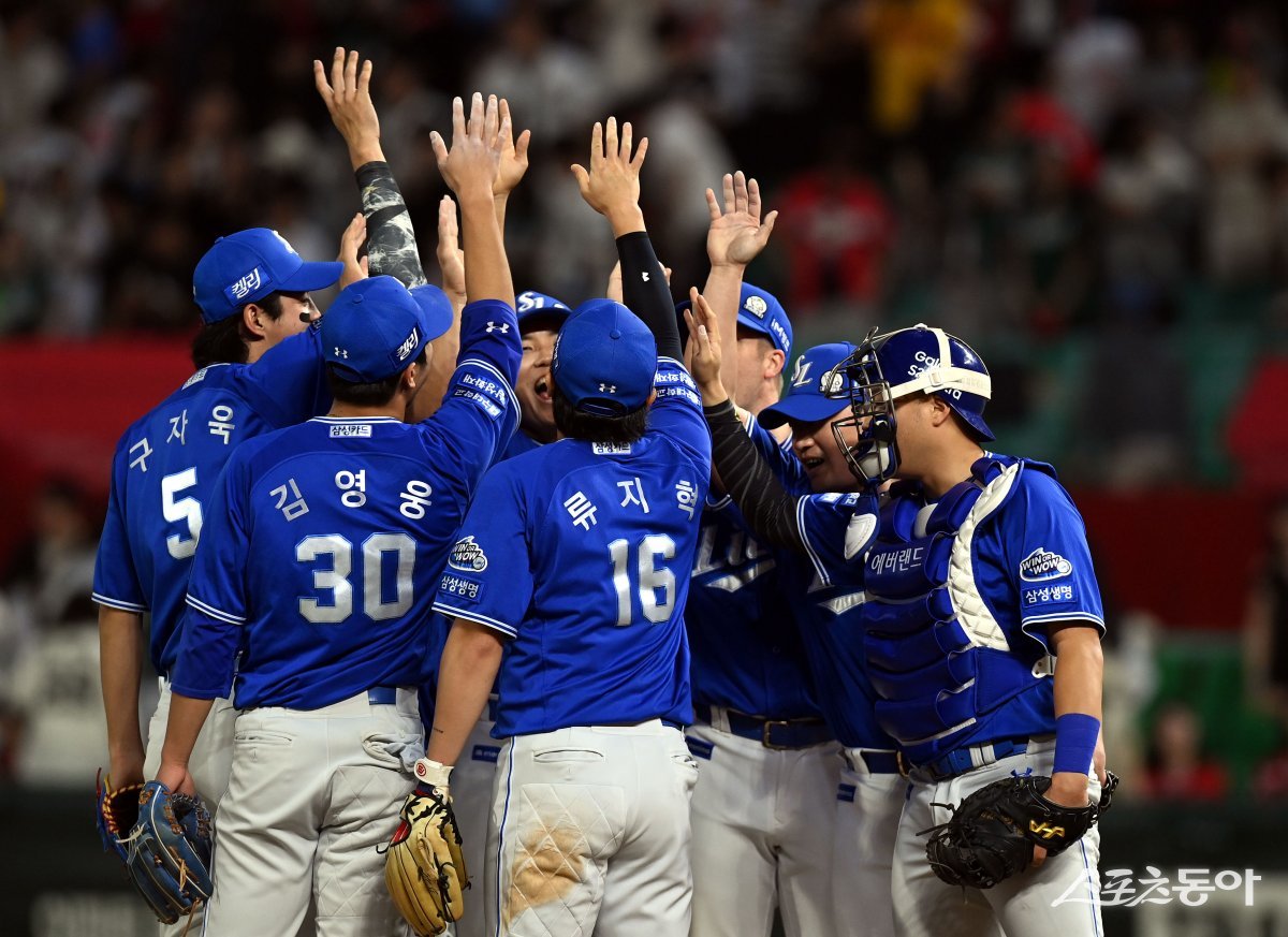 4일 인천 SSG 랜더스필드에서 ‘2024 신한 SOL 뱅크 KBO리그’ SSG 랜더스와 삼성 라이온즈의 경기가 열렸다. 삼성이 SSG를 상대로 3-1 승리를 거둔 후 선수들이 그라운드에서 기쁨을 나누고 있다.