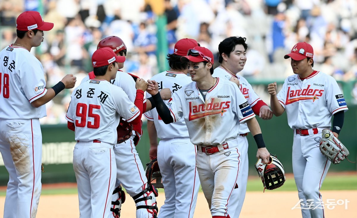6일 인천 SSG 랜더스필드에서 ‘2024 신한 SOL 뱅크 KBO리그’ SSG 랜더스와 삼성 라이온즈의 경기가 열렸다. SSG가 삼성을 상대로 4-0 승리를 거둔 후 선수들이 그라운드에서 기쁨을 나누고 있다. 인천 | 김민성 기자 marineboy@donga.com
