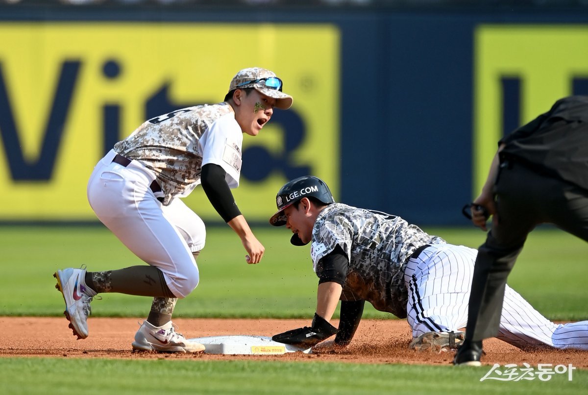 6일 서울 잠실야구장에서 ‘2024 신한은행 SOL뱅크 KBO리그’ 키움 히어로즈와 LG 트윈스 경기가 열렸다. 1회말 무사 1루 LG 홍창기가 2루 도루에 성공하고 있다. 잠실 | 김종원 기자 won@donga.com
