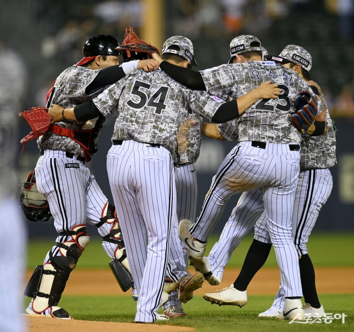 6일 서울 잠실야구장에서 ‘2024 신한은행 SOL뱅크 KBO리그’ 키움 히어로즈와 LG 트윈스 경기가 열렸다. 8-4 승리를 거두며 위닝시리즈를 기록한 LG 선수들이 기뻐하고 있다. 잠실 | 김종원 기자 won@donga.com