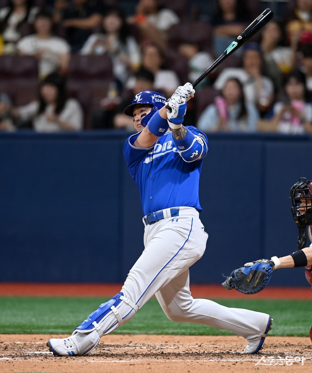 9일 서울 고척스카이돔에서 ‘2024 신한은행 SOL뱅크 KBO리그’ 삼성 라이온즈와 키움 히어로즈 경기가 열렸다. 7회초 1사 1,2루 삼성 박병호가 좌월 스리런 홈런을 날리고 있다.