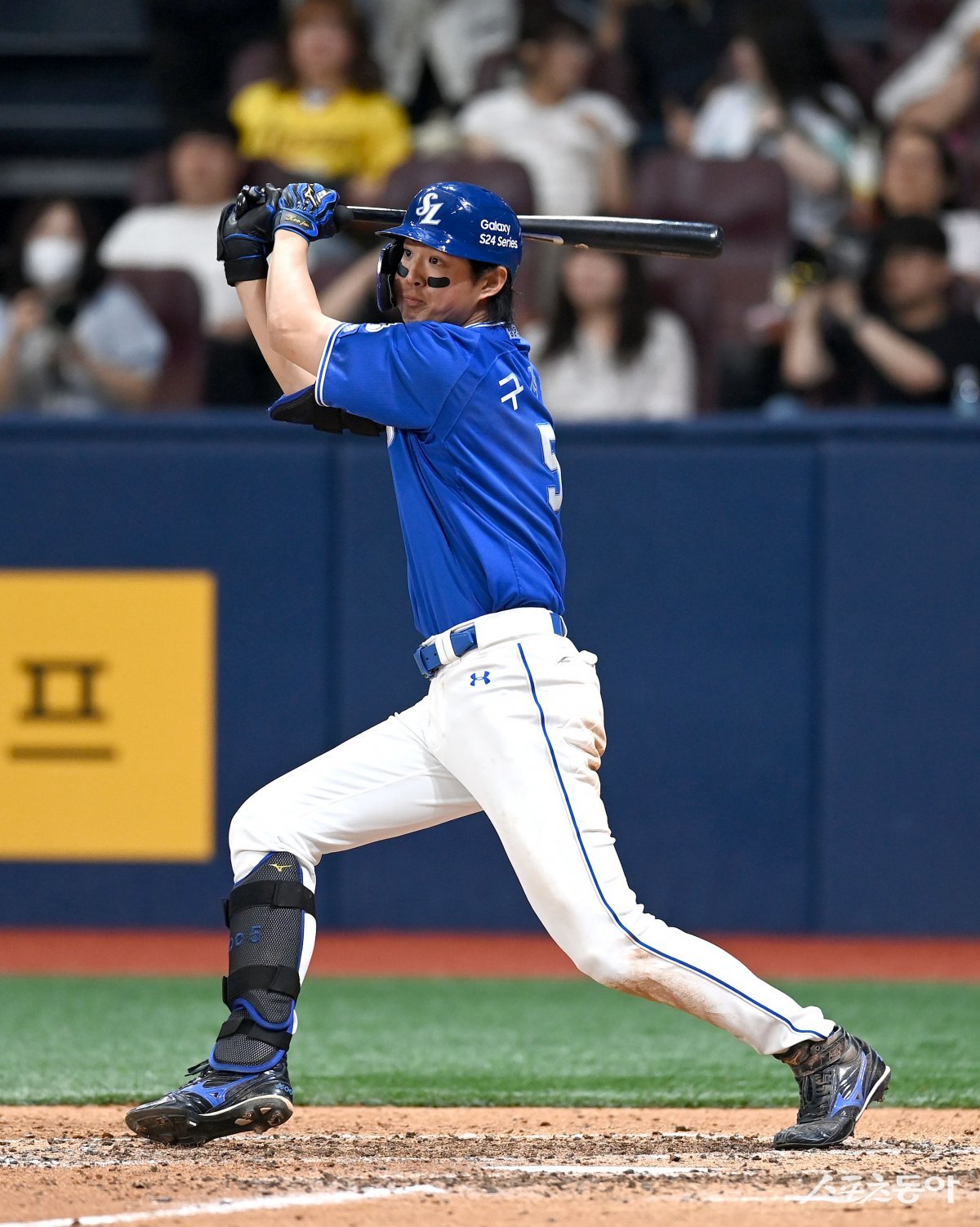 9일 서울 고척스카이돔에서 ‘2024 신한은행 SOL뱅크 KBO리그’ 삼성 라이온즈와 키움 히어로즈 경기가 열렸다. 7회초 1사 1루 삼성 구자욱이 좌전 안타를 치고 있다.